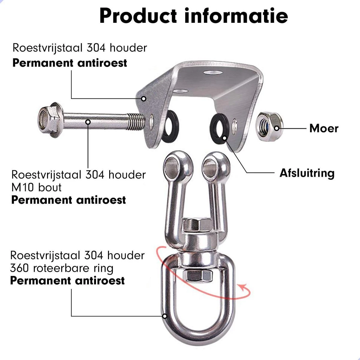 Geschikt voor hangstoelen, schommels, hangmatten en meer! De meest complete ophangset op de markt. Met de ophangset van DailyFox kunt u alles ophangen wat u wilt. De set bestaat uit het hoogwaardig RVS materiaal dat bestendigd is tegen alle weersomstandigheden.